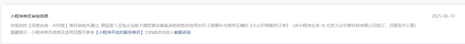 小程序类目审核结果2025-06-10你添加的【深度合成 - AI问答】类目审核未通过, 原因是:1.豆包企业版大模型算法备案说明资质含他用水印 2.需要补充提供正确的《火山引擎服务订单》(由小程序主体 与 北京火山引擎科技有限公司签订,且需双方公章)