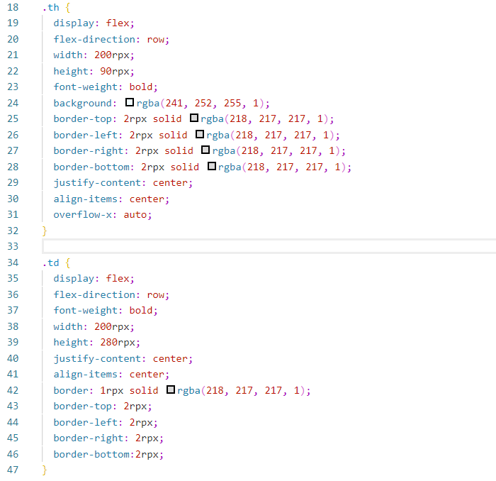 我想请教一下为什么表头的文本就居中显示,表格里的内容就无法跟表头的文字对齐,下面附上wxss文件中定义的td和th标签:请问该怎么做,才能使得表格中的内容和表头文字对齐