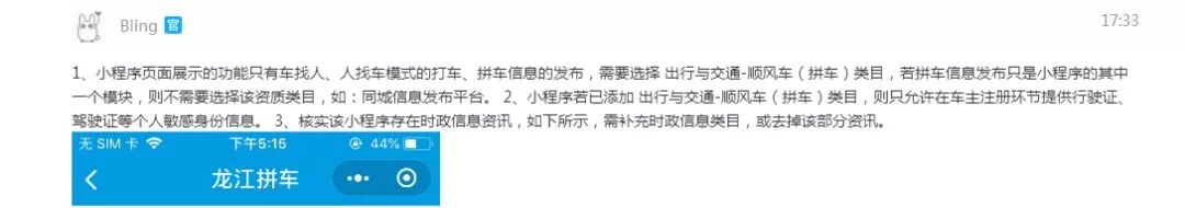 客服你好?关于我这个程序的审核,我还有最后一个问题:::针对上次客服给出的解答(下图),如果选择“同城信息发布平台”在车主注册环节只提供行驶证,是否可以?行驶证上面仅有关于车的信息,并不含有车主个人敏感身份信息?