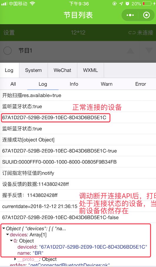 5.在小程序onBLEConnectionStateChange监听蓝牙连接状态方法中调用getConnectedBluetoothDevices打印当前连接设备,打印结果显示调用API断开的设备依然存在打印列表中