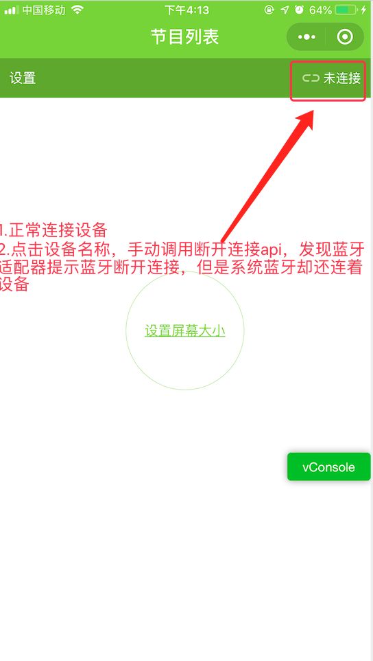 3.点击断开连接,调用closeBLEConnection,通过onBLEConnectionStateChange监听设备断开状态,显示正常断开