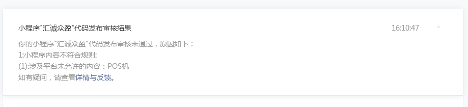 你好,经核实,贵方小程序简介为:线上出售刷卡机,请修改,并将小程序内容自查完善后重新提交审核。