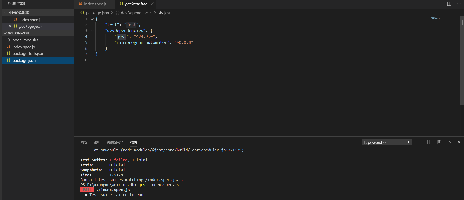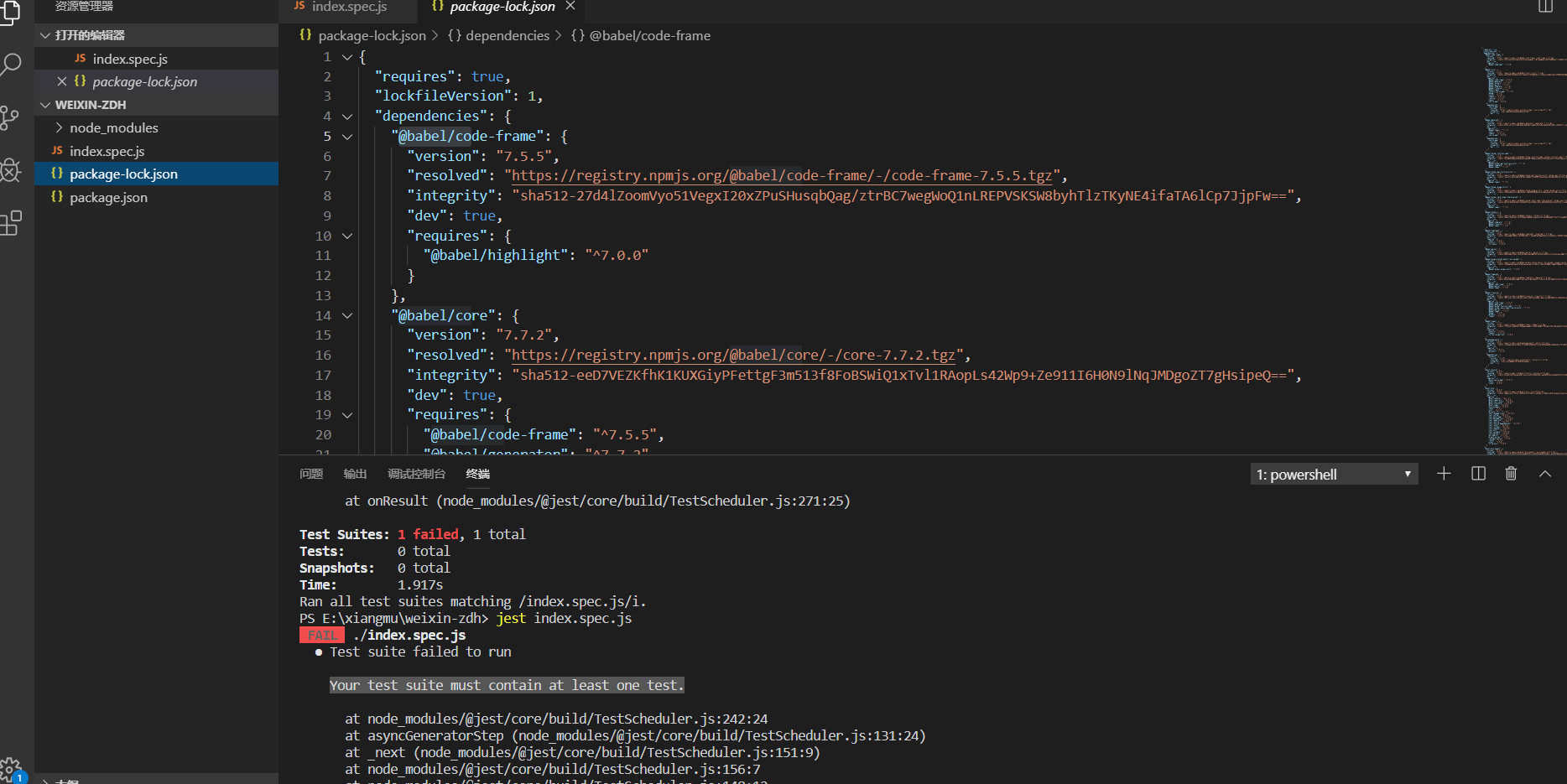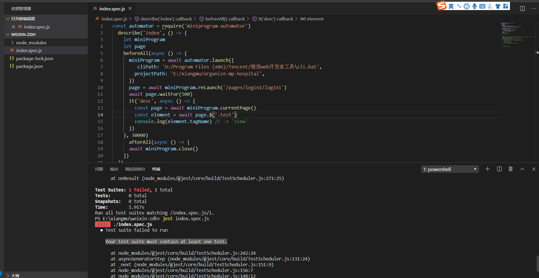图中已经提示了,脚本里面至少要包含一个测试,类似于 it('xxx', () => expect('xxx').toBe('xxx')) 这样的代码,详细用法可以搜索下 jest 测试框架的教程。