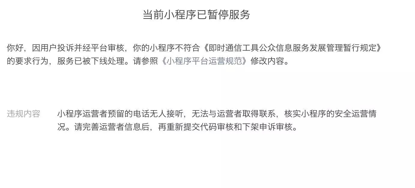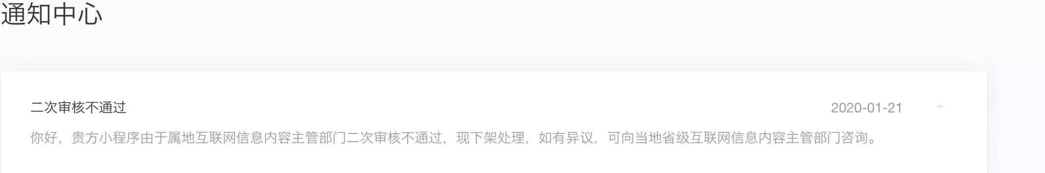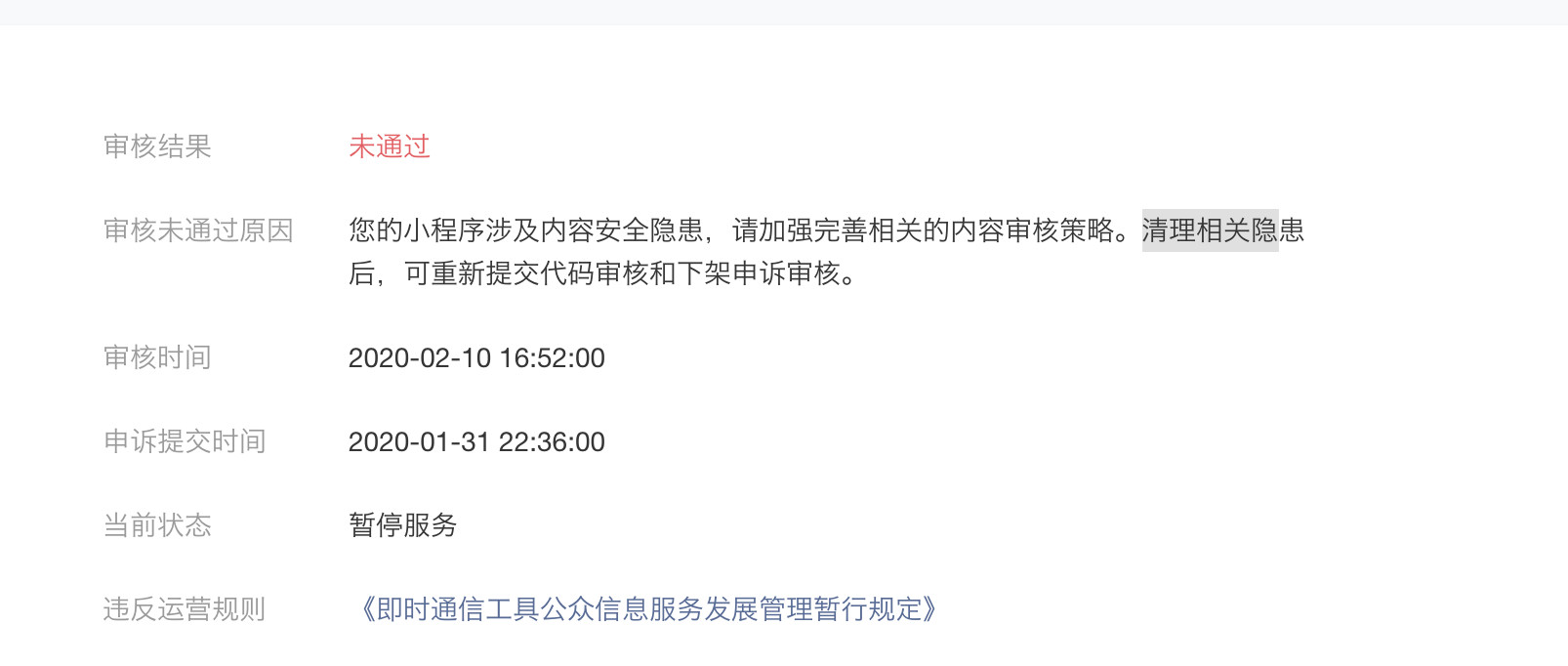 我们的小程序属于社交-直播类目,根据该类目的要求,我们向政府申请了《网络文化经营许可证》并审核通过。公司注册地是湖北省。小程序一直使用正常使用,却于2020年01月21号被下架,甚至没有给整改期限。图1是通知中心收到的消息,图2是申述页面。其中提到的《即时通讯工具公众信息服务发展管理暂行规定》,链接http://www.cac.gov.cn/2014-08/07/c_1111983456.htm,我们申请时没有被告知需要这方面资质,而且我们只是一个卖衣服首饰的直播工具,也不符合里面提到的适用范围。能否告知一下,是什么原因要怎么解决?