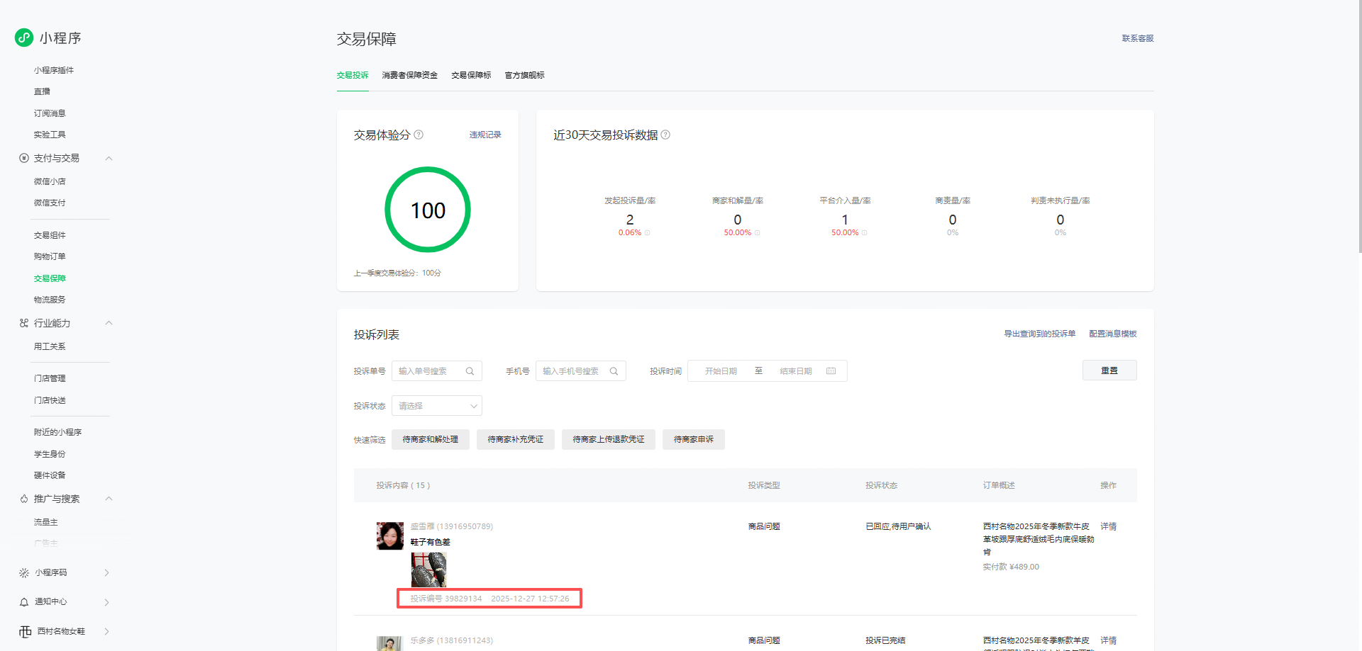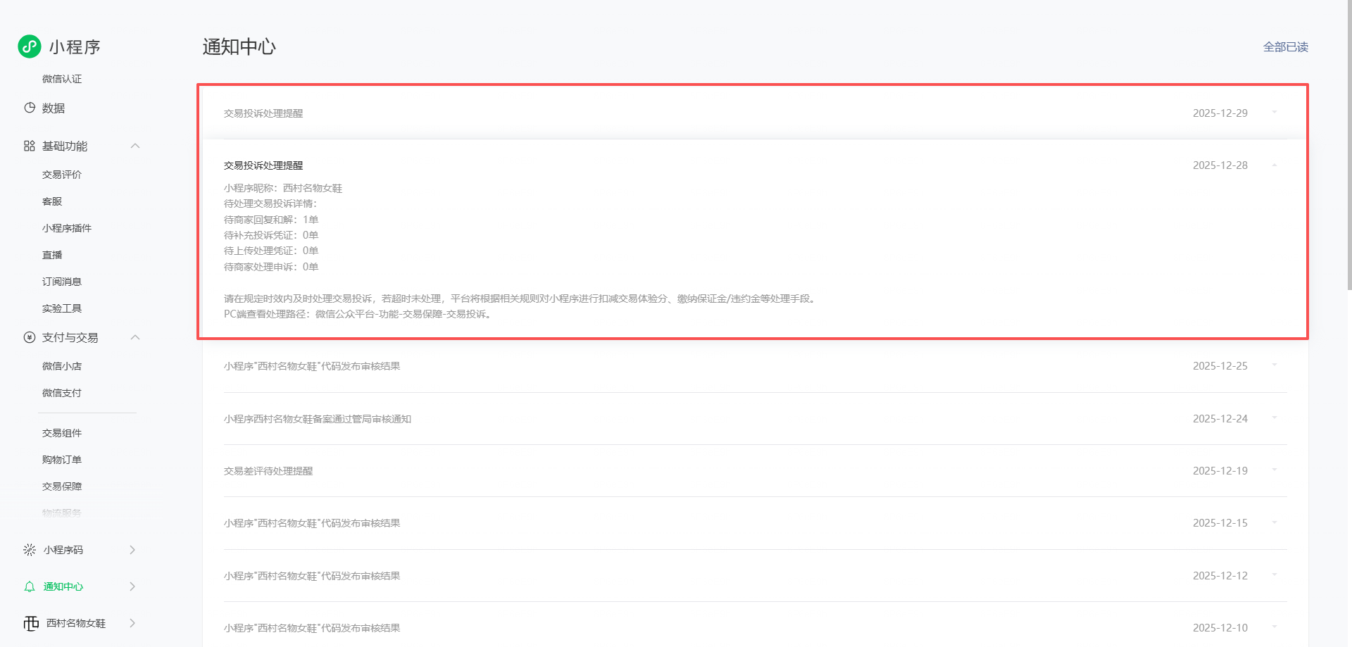 为便于小程序开发者及时获知小程序交易投诉情况,平台将于每天早上10:00向小程序的管理员及运营者推送通知,通知内容为截至前一天24时该小程序账号内待开发者处理的投诉单详情。 若商家已经处理则不会显示在交易投诉待处理中。