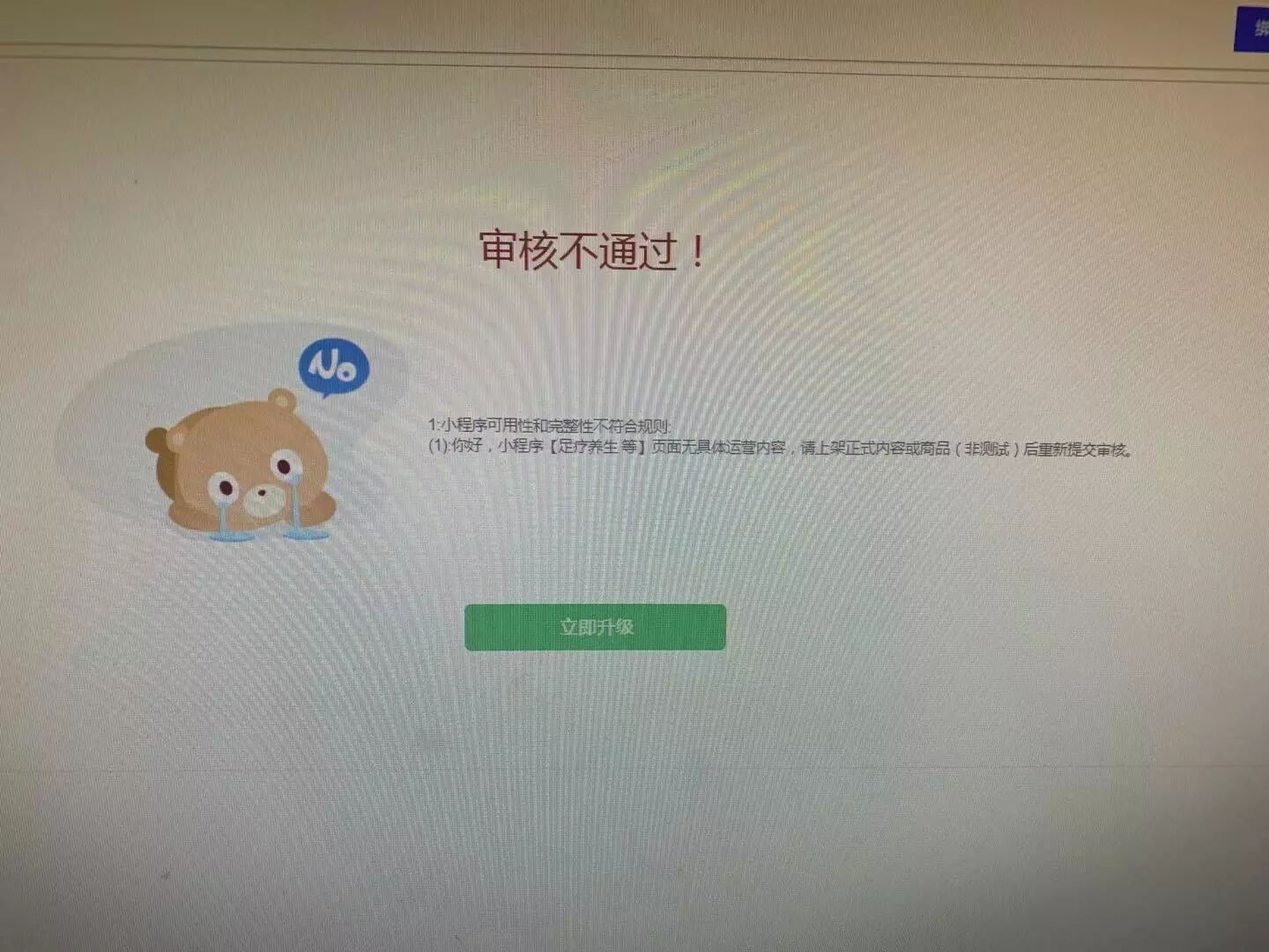 小程序(足疗养生)等页面无具体内容,请上架正式内容或商品(非测试)后重新提交审核。