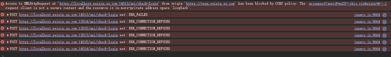 Access to XMLHttpRequest at 'https://localhost.weixin.qq.com:14013/api/check-login' from origin 'https://open.weixin.qq.com' has been blocked by CORS policy: