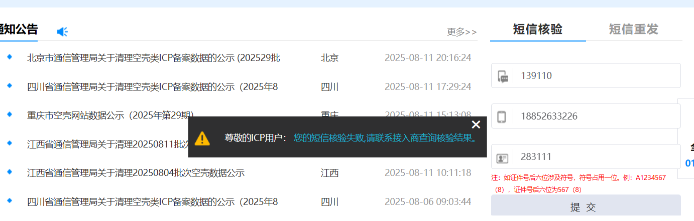 小程序备案信息都正确,短信验证反复提示:尊敬的ICP用户: 您的短信核验失败,请您重新验证。