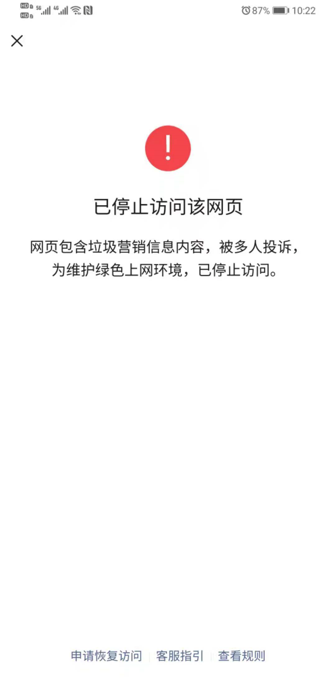 你好,请提供实时点击链接时出现拦截页的微信号、时间,以便我方核实。