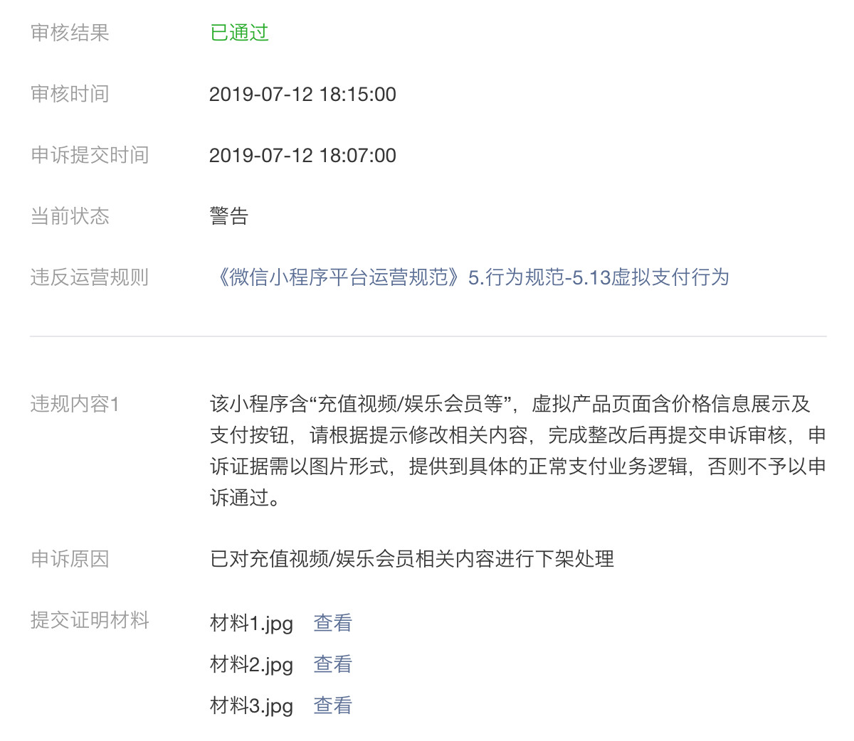 在7月10日我们收到了涉嫌违规的处理警告,我们于7月12日将虚拟商品全部下架,并在首次申诉时通过。