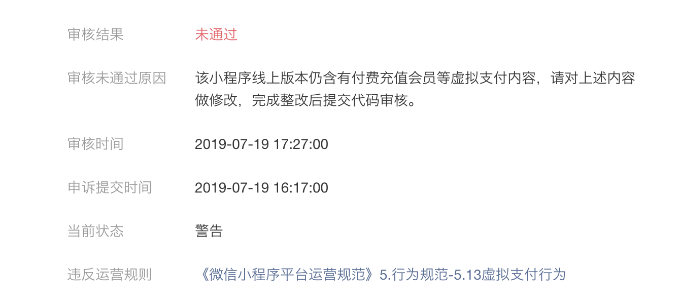 但在7.19日依然收到了IOS支付接口被封禁、以及IOS用户搜索小程序被暂停的通知,并且申诉未通过。