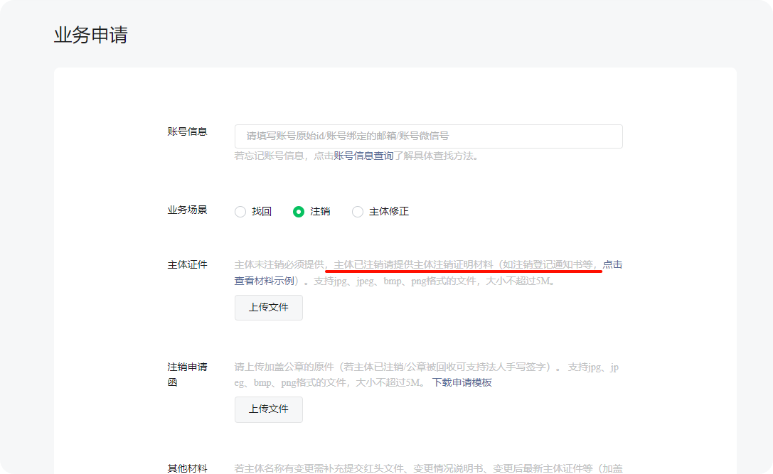去工商开具主体注销证明,然后上传注销账号。https://mp.weixin.qq.com/webpoc/accountBack