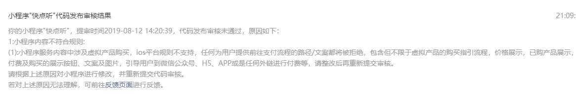 你好,经核实,贵方小程序最新提审版本打开仅有引导下载app内容,无具体运营内容/功能,请重新定位小程序功能,完善业务核心功能后重新提审。