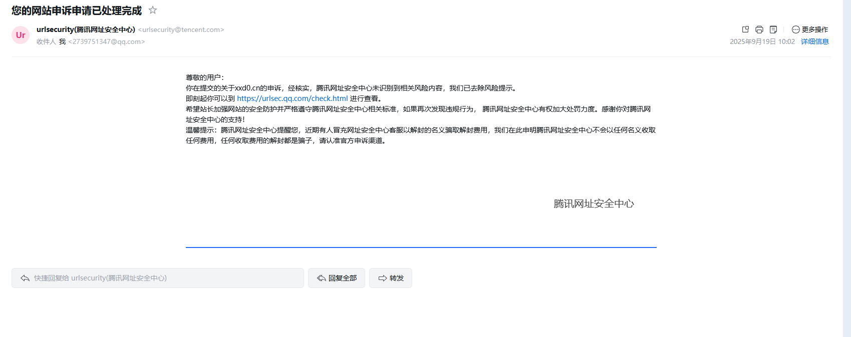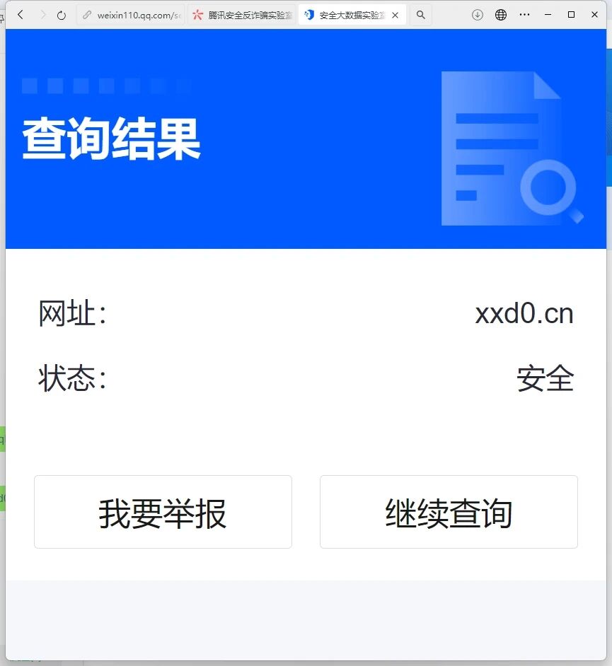 也使用了「腾讯安全-网址安全中心[6]」对网站域名进行检测,显示的是域名安全,但是就是显示需要继续访问,这个大大影响了我,麻烦审核大人解封一下,恢复一下微信内可直接访问该域名服务谢谢。