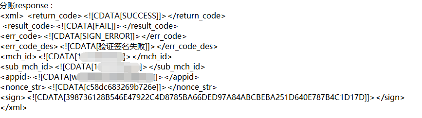 2,我按照传入的参数可以看到支付成功,并且该笔金额被冻结,待分账状态,可是返回值一直报“签名错误”,我在签名工具中验证,却没有问题。https://pay.weixin.qq.com/wiki/doc/api/micropay.php?chapter=20_1