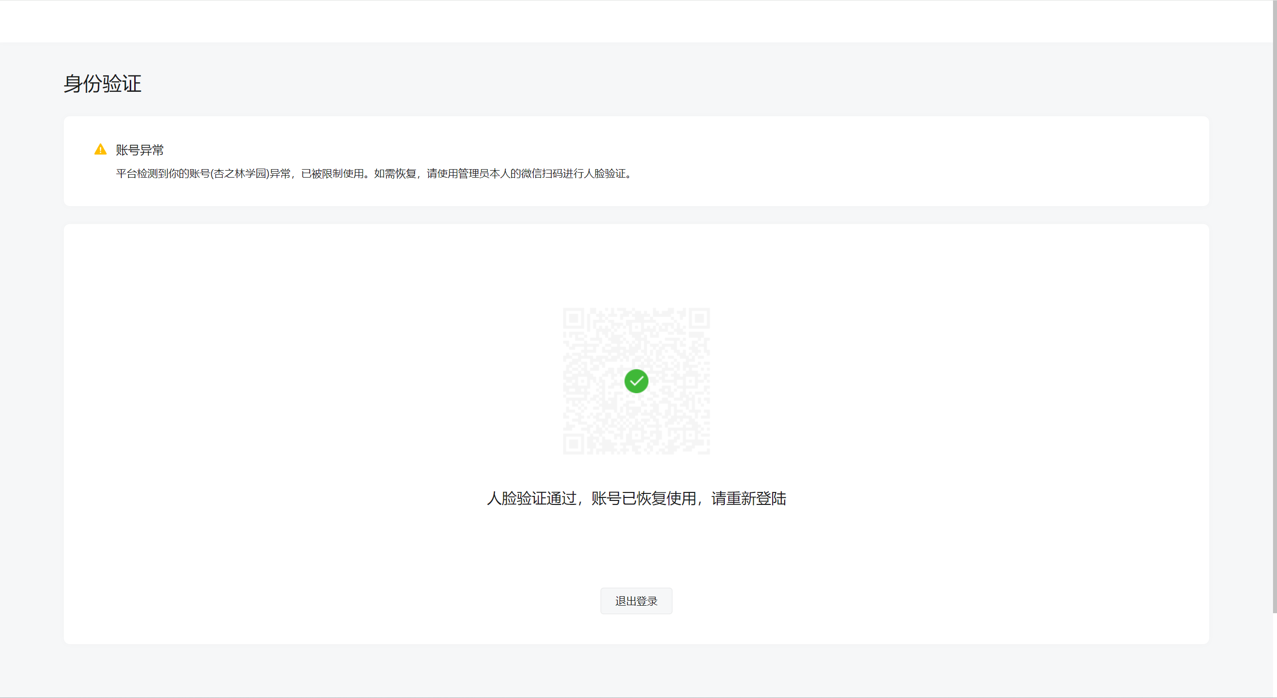 【平台检测到你的账号(杏之林学园)异常,已被限制使用。如需恢复,请使用管理员本人的微信扫码进行人脸验证。】