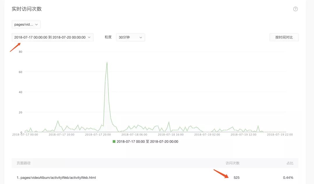 针对单个页面访问次数,选择同样的范围。实时统计出来的次数是538次,而访问分析中的次数是174次。