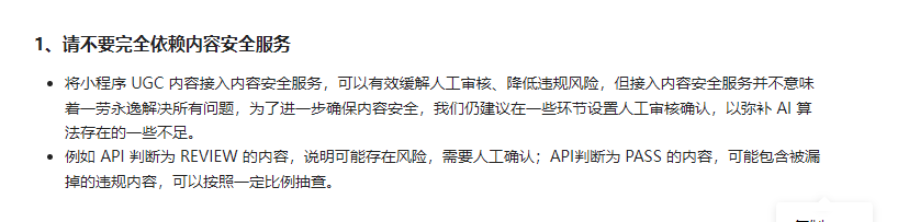 你好,小程序对于违法违规等不当信息的过滤机制包括但不限于接入官方内容安全接口/人工复核/先审后发/开发者自行设置关键词过滤等方式,请加强提升小程序的信息安全防护能力,降低被恶意利用导致传播恶意内容等风险