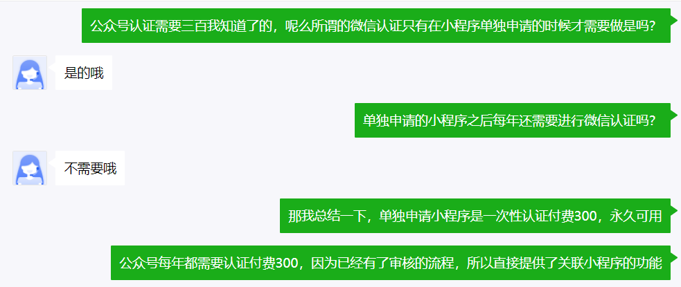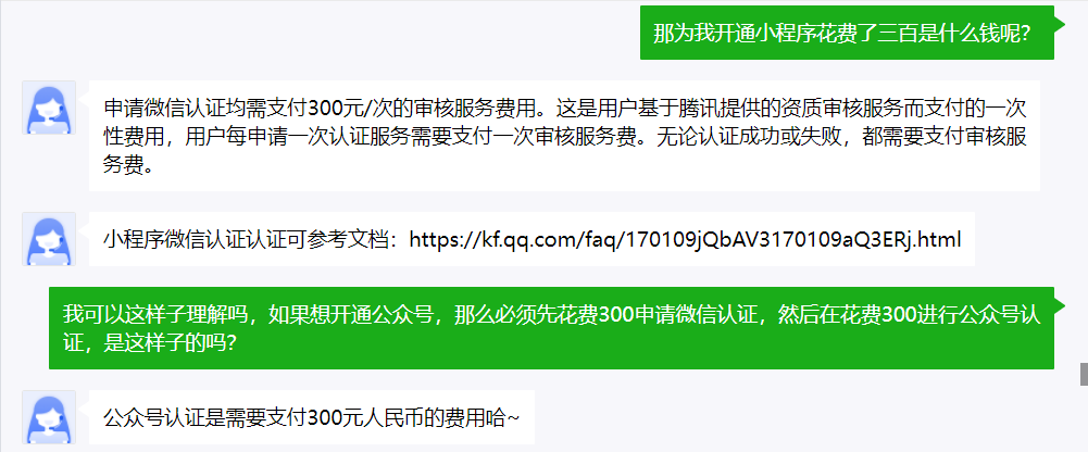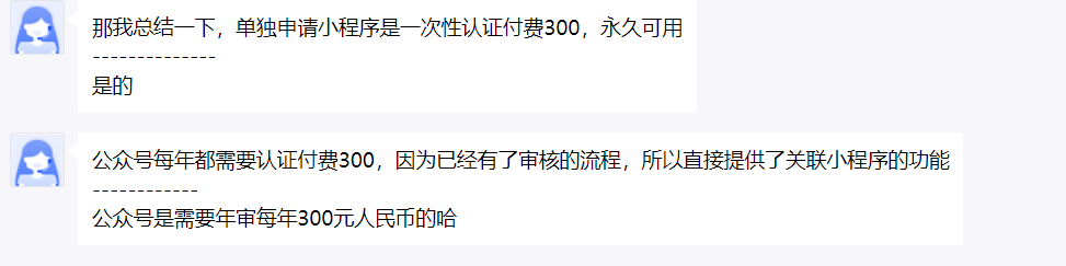 2.查询各方面资料告诉我如下结果,如果我现在先花费300认证了小程序,那么我接下来想认证公众号的话还需要花费300,不知道现在为之是不是这样子的