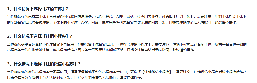我变更了微信小程序的主体,由子公司变成了集团,现在我需要对主体进行重新备案,这个注销备案有三个选项,描述很模糊,我不能确定我选择哪个,并且在微信开发社区里面的说明也非常模糊,而且一旦确定有很大风险,我具体应该选择哪个变更呢,主体?小程序?还是微信小程序,他们有什么区别呢?