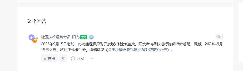 2023年9月15日之前,此功能逻辑只对开发版/体验版生效,开发者请尽快进行隐私弹窗适配、发版。2023年9月15日之后,将对正式版生效,详情可见《关于小程序隐私保护指引设置的公告》。