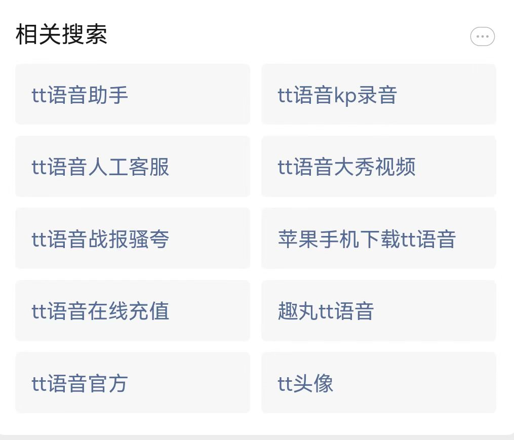 在微信搜索TT语音,下方的相关搜索中出现“TT语音战报骚夸”、“tt语音大秀视频”等擦边词条,是不准确内容,TT语音并未有任何擦边信息,请平台删除该类词条,免误导用户