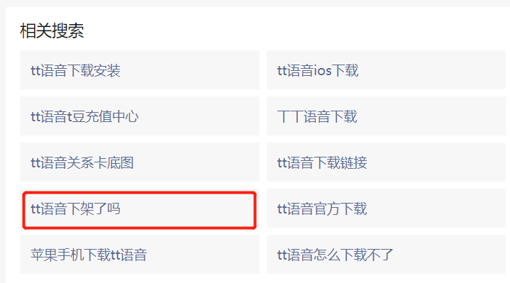 在微信搜索TT语音,下方的相关搜索中出现“TT语音下架了吗”该词条,是不准确内容,TT语音现在并未下架,官网仍可下载,请管理员删除该不正确词条,避免误导用户