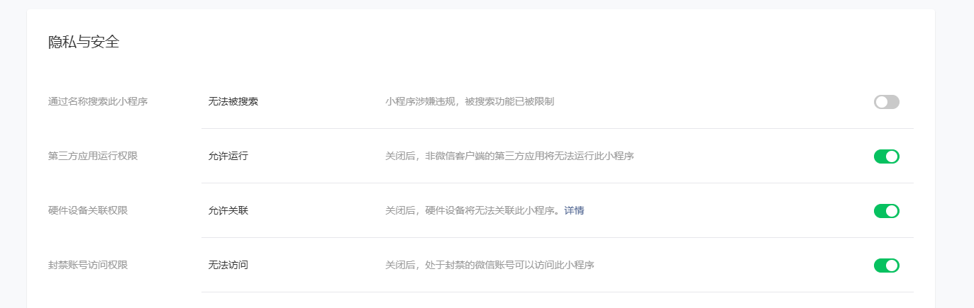 小程序设置页面显示:小程序涉嫌违规,被搜索功能已被限制,开关被禁用。