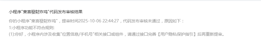 你好,若是授权第三方开发的小程序,建议让开发者单独提交下用户隐私协议审核通过后,再重新查看下接口状态,详情可参考: