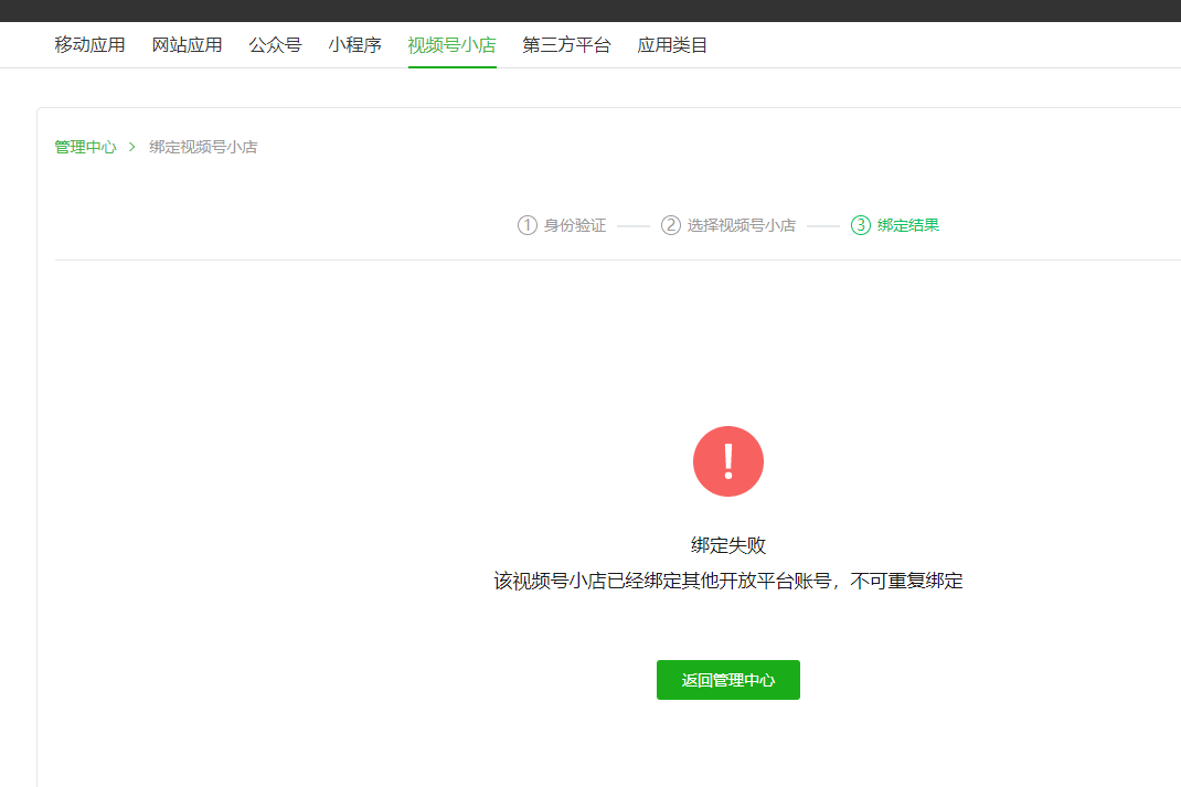 由于我司需要绑定视频号小店到开放平台,但是绑定的时候,系统提醒该视频号小店已经绑定其他开放平台账号,但是我们也不不知道如何找到那个绑定的账号去解绑,请问官方这边怎么办