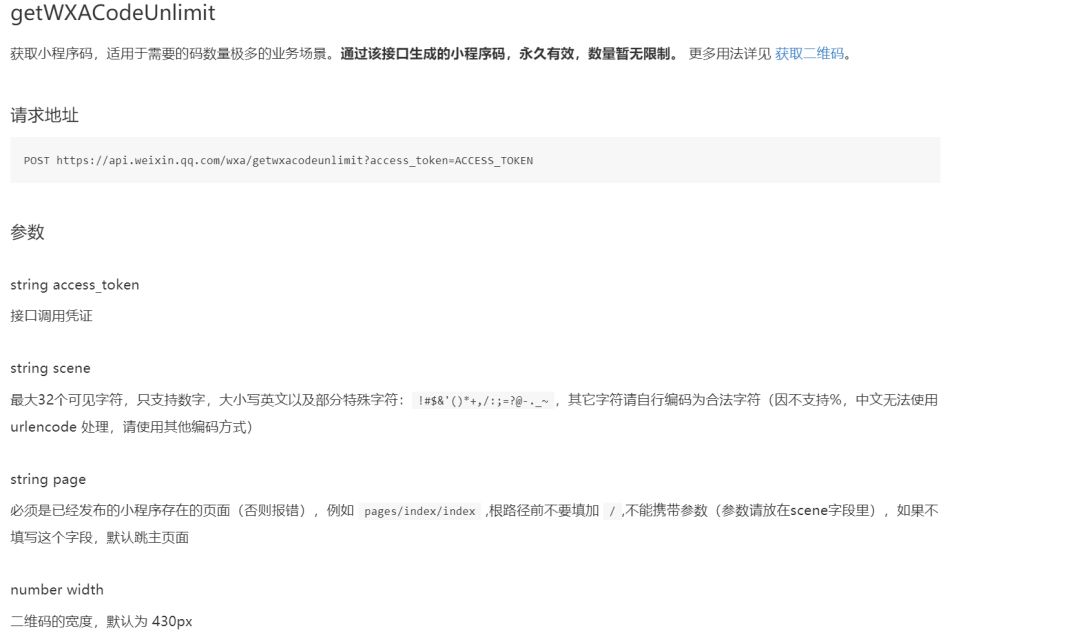 https://developers.weixin.qq.com/miniprogram/dev/api/open-api/qr-code/getWXACodeUnlimit.html