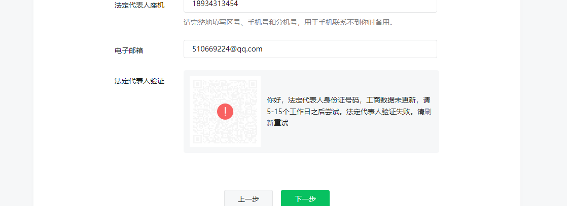 你好,法定代表人身份证号码,工商数据末更新,请5-15个工作日之后尝试。法定代表人验证失败