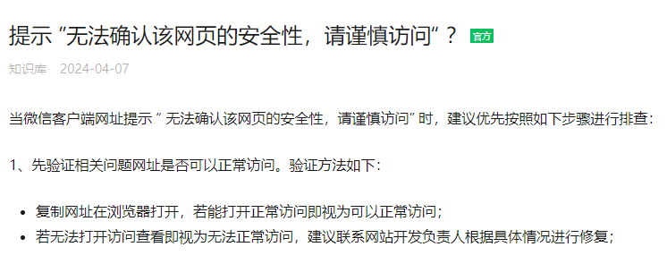 微信内访问网站出现“无法确认该网页的安全性,请谨慎访问”的拦截提示,网站符合《微信外部链接内容管理规范》,腾讯安全网址安全中心检测网页没有不安全的内容,请求核实后解除在微信内的访问拦截提示,谢谢