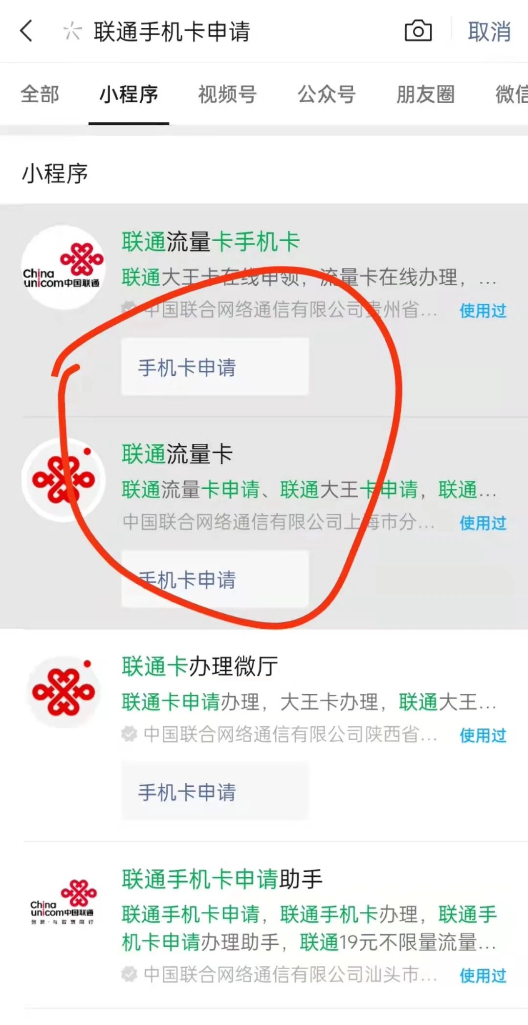 上述图片是我在微信搜一搜关于联通手机卡申请这一个关键词出现的各家小程序、公众号的服务搜索与类目,但是上图所展现的小程序的服务搜索、公众号服务搜索用的都是同一家公司,同一个域名,排名展现的也基本都是这一家公司,其他省、市联通的运营公告服务申请成功后基本不会给我们前排显示。