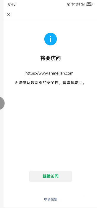 微信访问网站,https://wwwahmeilan.com 出现提示:无法确认该网页的安全性,请谨慎访问。https://wwwahmeilan.com 为企业备案网站,无任何非法内容,请核实后帮忙解除拦截,谢谢!