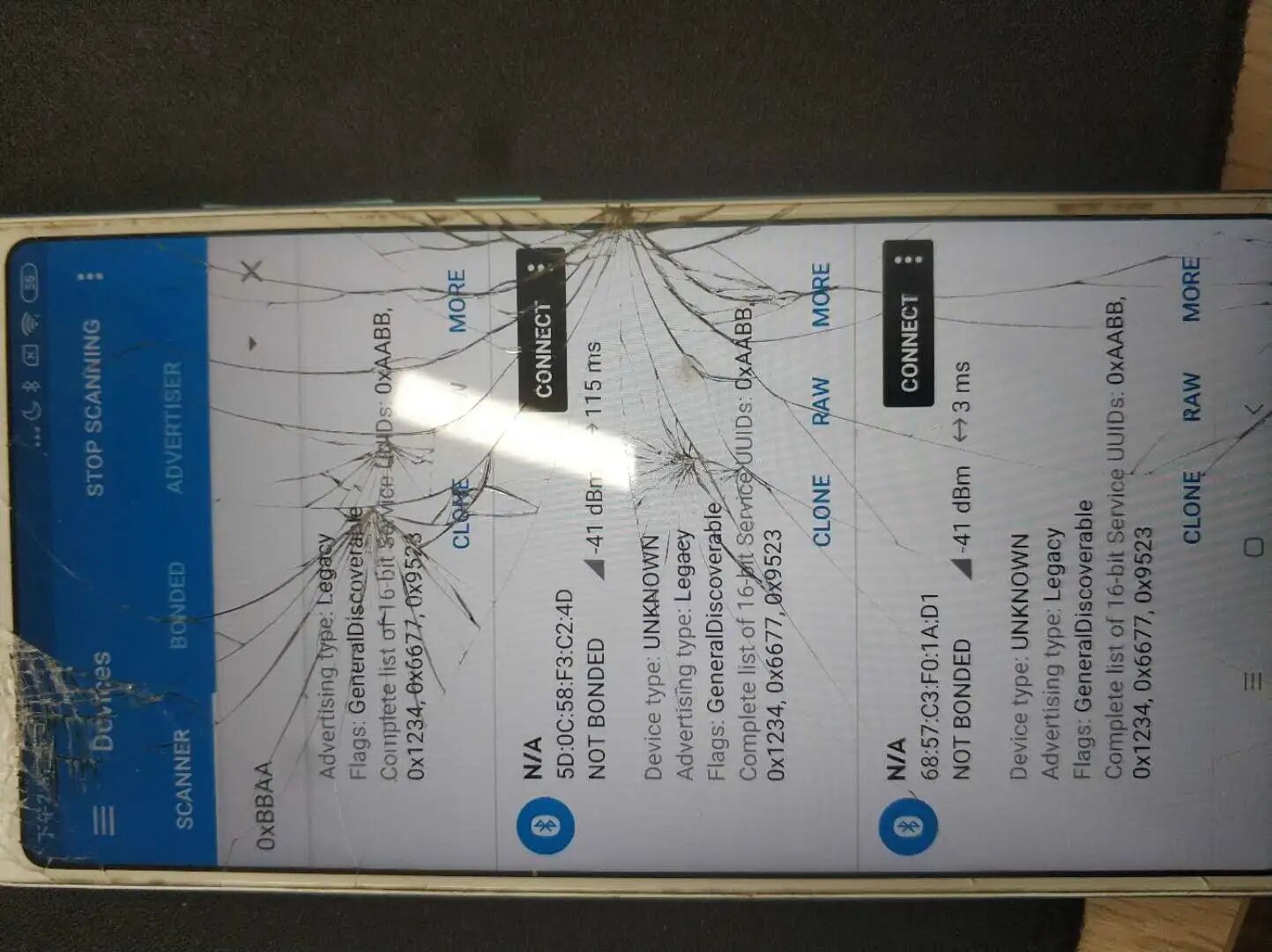 以代码片段举例,先打开手机蓝牙,然后匀速左右滑动进度条大概持续10S。然后拿另一个手机打开nrf connect这个广播包抓包工具,用BBAA过滤广播数据,搜索广播包。
