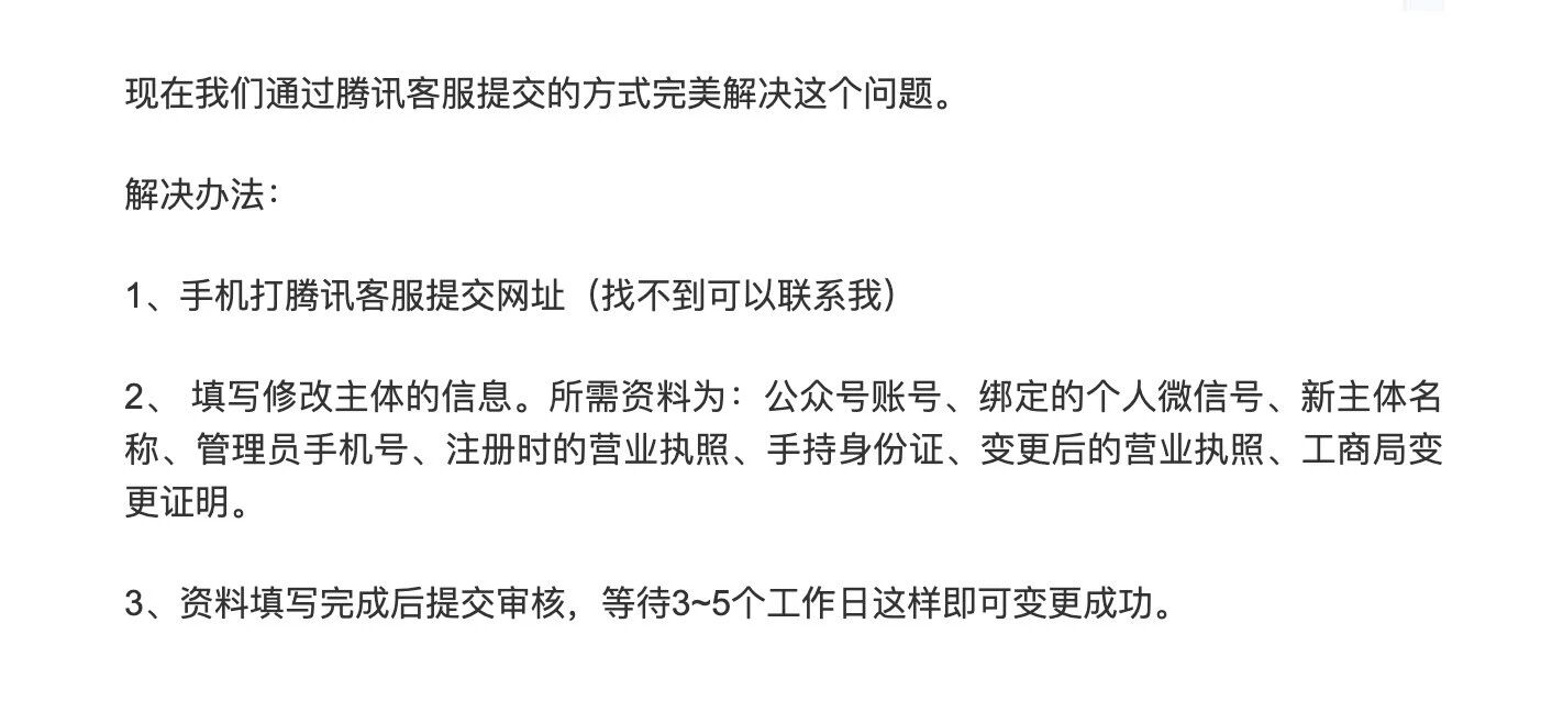 公司在工商局的名称已修改更新,公众号的主体名称也已经更新名称,但是之前关联的小程序上的主体名称还是之前旧的,但是小程序没有修改名称的入口,这边仅需修改名称,不更换公司主体~