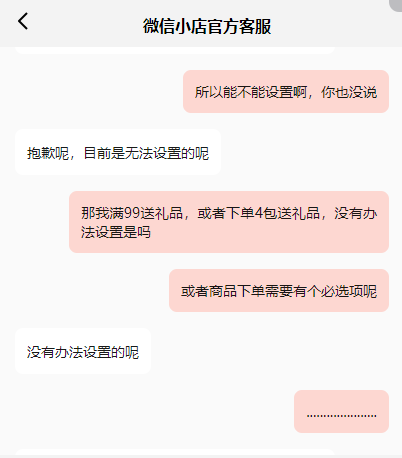 我想在微信小店做满99送赠品活动,或者下单够4包送实物赠品,但是!!根本没法设置,不设置我的仓库就分不清哪个订单需要送赠品,为什么后台只能设置时间+主商品+赠品数量,连门槛满多少金额赠送、多门槛阶梯赠送这些都不能设置,这不就相当于不管买多少包,不管金额,这个链接只要下单就送,那我的商品规格1包价、2包价、4包价还搞什么?,反正下单就送了,有什么别的办法能做到吗??