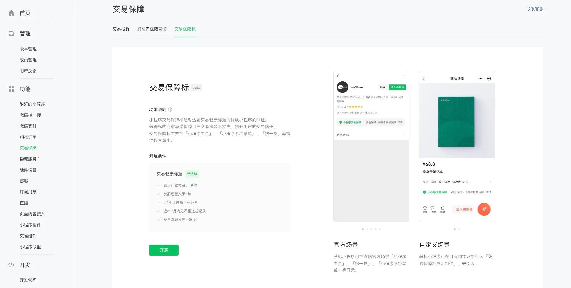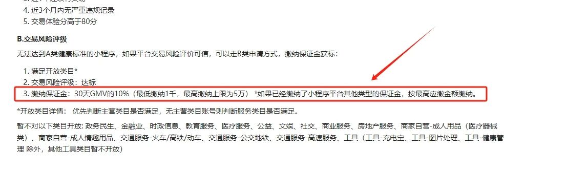 你好,若通过B类途径开通交易保障标,在「开发者终止小程序经营、申请关店时」,可申请退换保证金,关于退换保证金的详细内容参考文档:https://developers.weixin.qq.com/miniprogram/dev/platform-capabilities/business-capabilities/ministore/minishopopencomponent2/baozhengjin.html