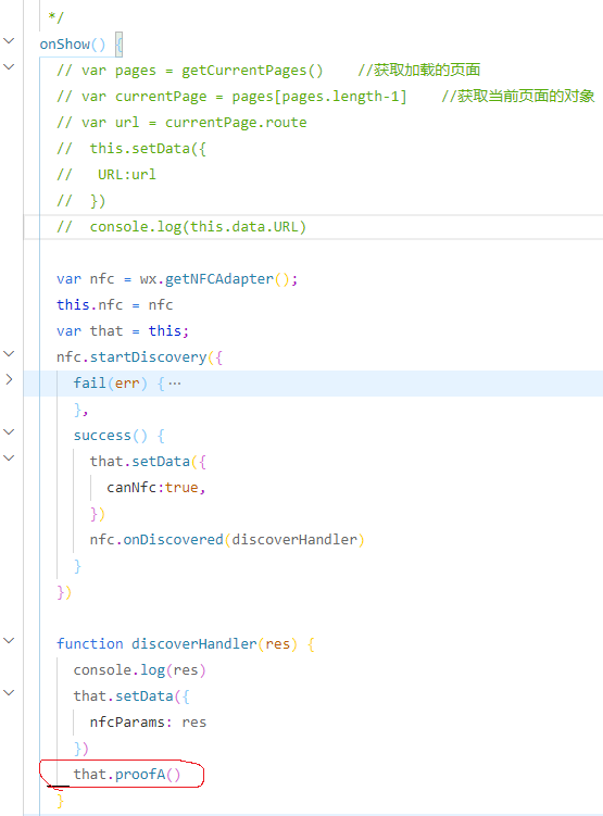 红圈内的proofA()方法是nfc读卡流程,里面有大量异步回调流程,其中在成功识别nfc信息后,会setData()页面data中的属性值,如:setData({