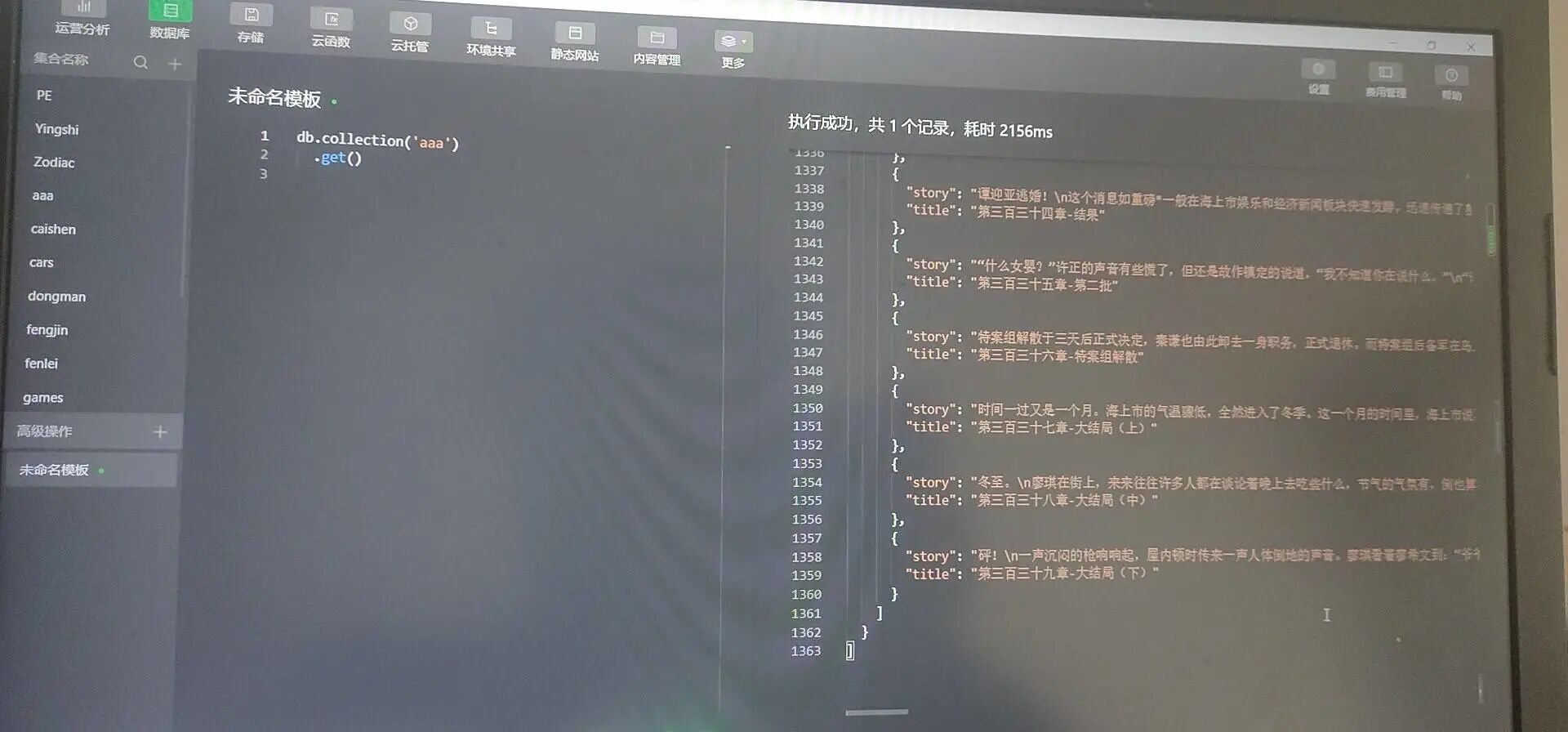 数据库里面一个集合里的数据有300多条为什么前端就打印不出来这个,几十个的时候就可以打印,数据权限已更改同样的代码为什么这里可以显示前端页面就答应不出来?求答谢谢!