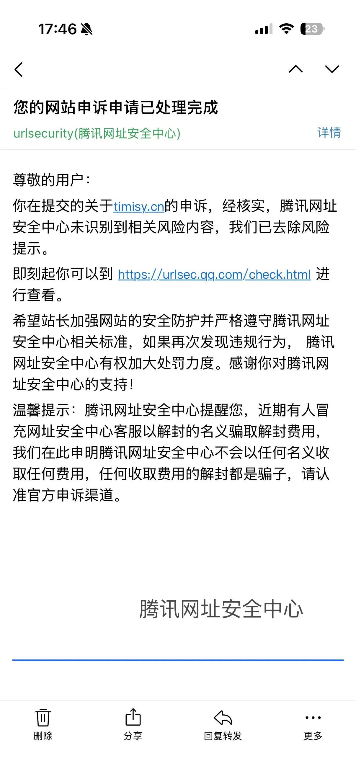已经申诉成功了域名依然无法在qq和微信打开依然是拦截,腾讯网址安全中心也提示无风险,能不能来个人解决一下啊
