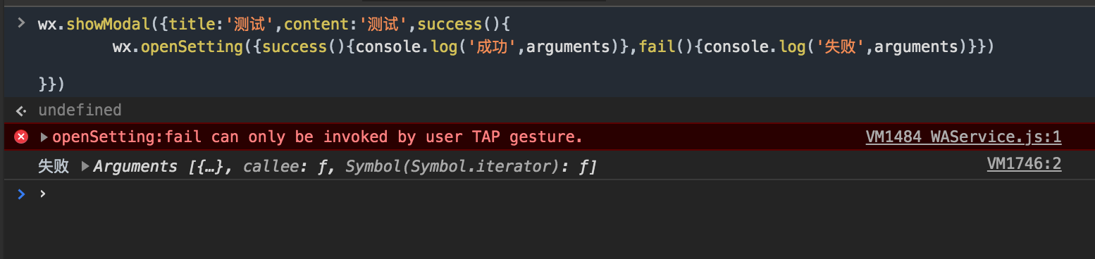 wx.openSetting({success(){console.log('成功',arguments)},fail(){console.log('失败',arguments)}})