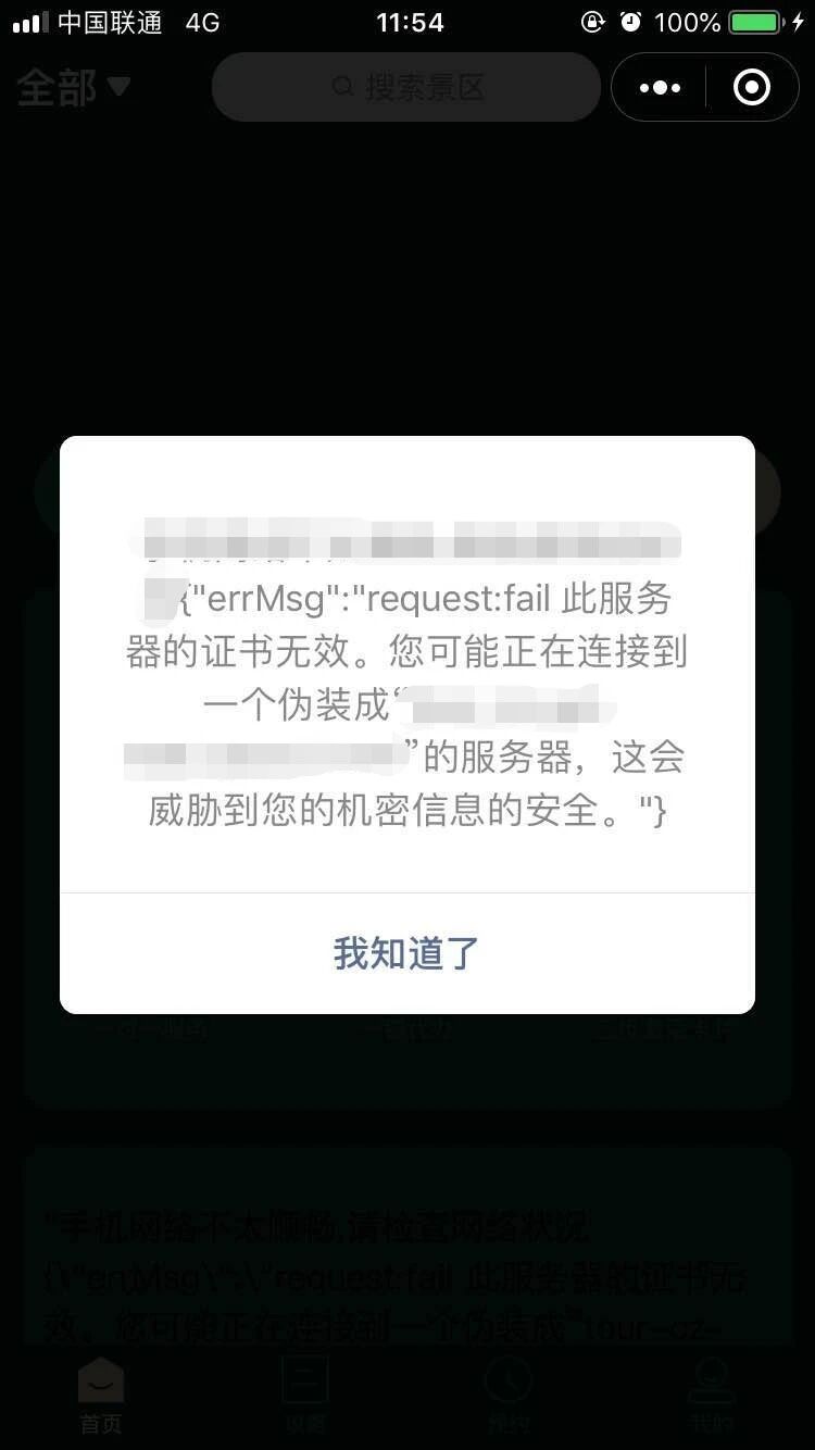 进去到小程序后,所有请求都报错,报错信息如图所示,提示证书无效,可是其他手机是可以的