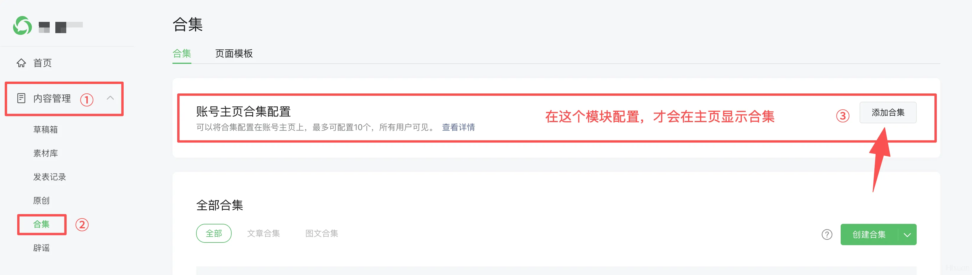 图片2:这个是公众号/服务号主页,这里展示的合集,可登录微信公众平台 https://mp.weixin.qq.com —— 内容管理 —— 合集 —— 账号主页合集配置 —— 添加合集。