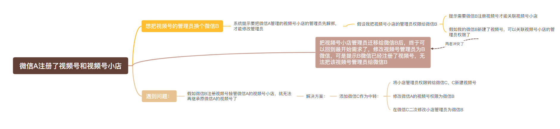 详细逻辑和BUG,看看思维导图,虽然做得不好,但是逻辑上一定是有问题,要多一个微信中转了,视频号小店无形中更换了两次管理员,一年只能更换两次管理员,容易导致出错