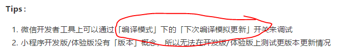updateManager.onUpdateReady(function() {wx.showModal({title:'更新提示',content:'新版本已经准备好,是否马上重启小程序?',success:function(res) {if(res.confirm) {// 新的版本已经下载好,调用 applyUpdate 应用新版本并重启updateManager.applyUpdate()}}})})另外,官文中提及可以通过“编译模式”下的“下次编译模拟更新”开关调试,我没找到这个开关。