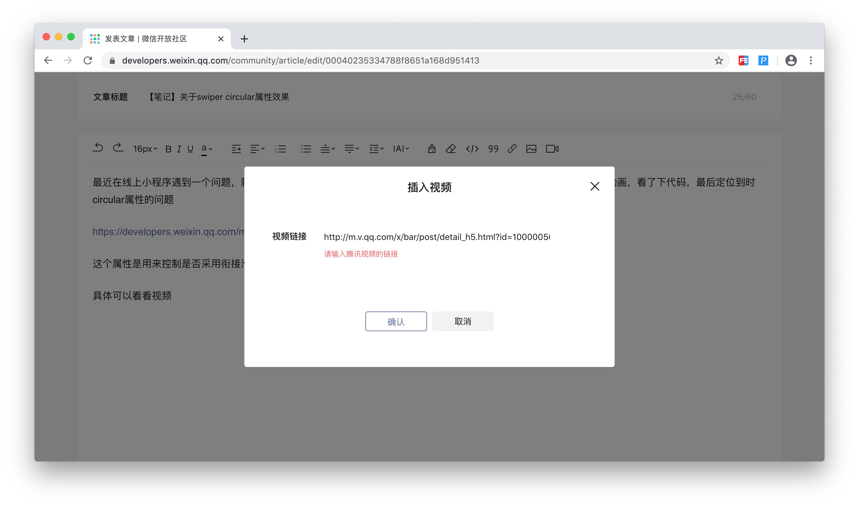 具体就是在文章中插入视频,视频连接来自腾讯视频,刚从腾讯视频提取的链接,点击确认的时候,却提示报错,具体视频连接如下