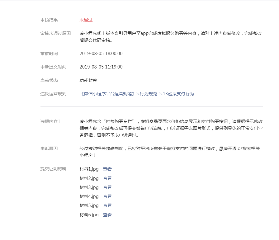 您好,我司的小程序IOS端内因含有虚拟支付充值的关键词,被违规警告、暂停IOS搜索功能、虚拟支付封禁,我们开始没有找到真正的整改原因,在申诉的时候咨询了具体的原因,我们得知原因后第一时间进行了整改,目前新版本提交审核通过并上线。彻底清除了问题因数,感谢您的指正,我们今后将确保该问题不会再次发生。但是由于找不到再次申诉入口,发此问题烦请官方审核通过解除限制~