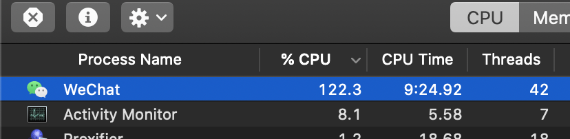 微信日常使用中CPU占用只在个位数,最近更新之后,视频通话时CPU占用立马飚到120%左右,导致视频画面严重卡顿。